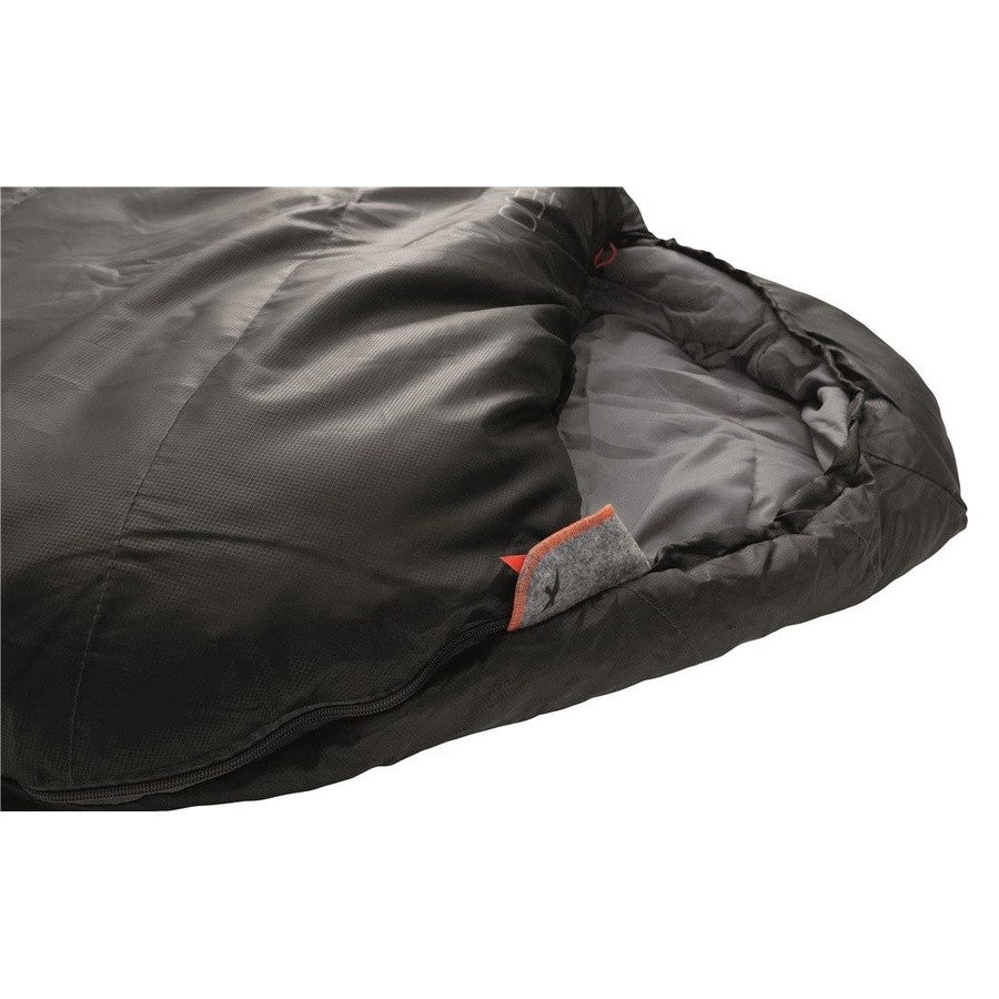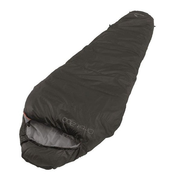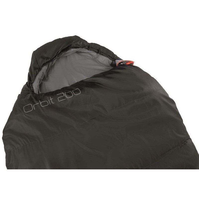 The Easy Camp Orbit 200 Sleeping Bag is a 3-season mummy-shaped sleeping bag designed for camping use. It features a ridge hood and neck baffle, both with draw cords, plus a full-length zip baffle and anti-snag zip guard. The sleeping bag includes an inside pocket and external hanger loops.