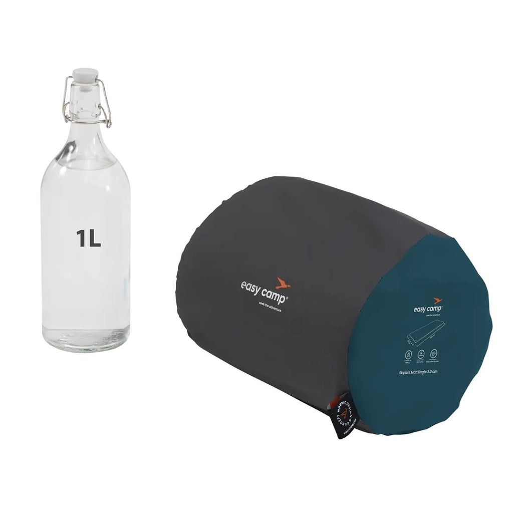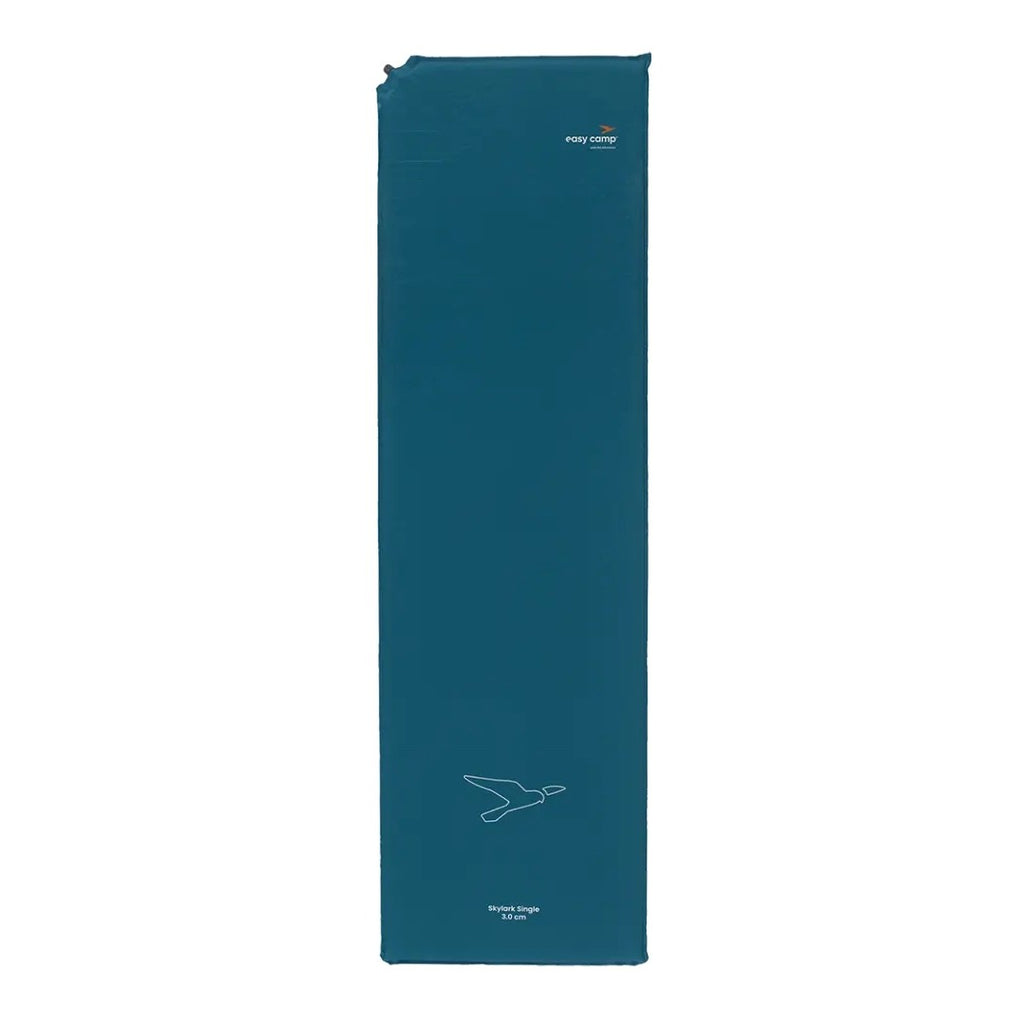 The Easy Camp Skylark Single 3.0 cm self-inflating mat is designed for portability with added ground insulation. It has a classic rectangular shape and is made from soft polyester fabric for comfort and low friction noise. The mat uses the Easy Valve System for quick inflation and deflation and includes a stuff bag.