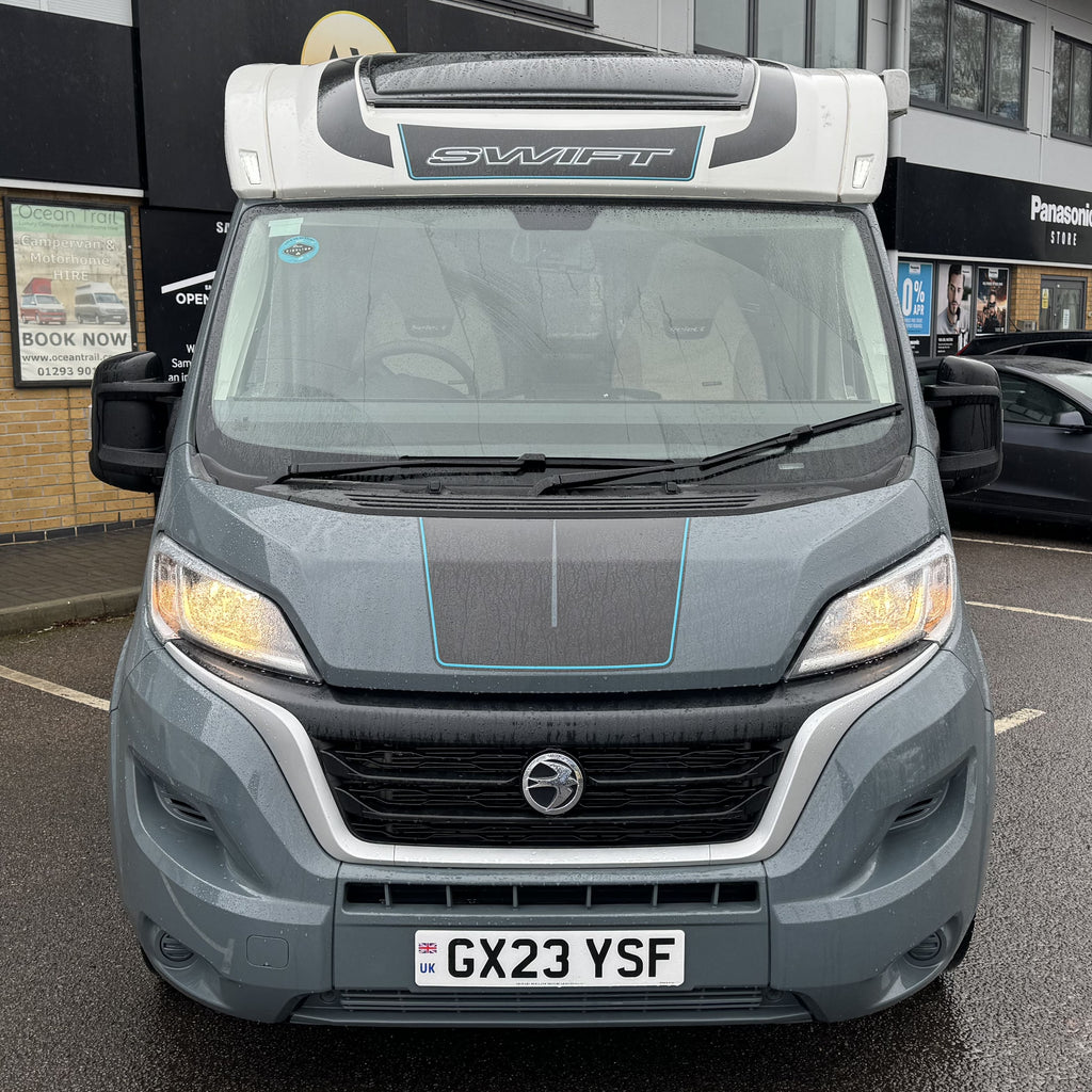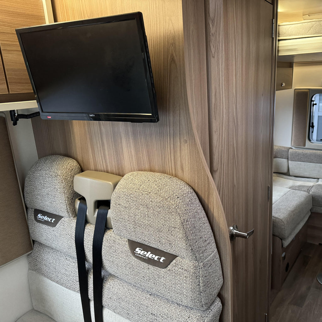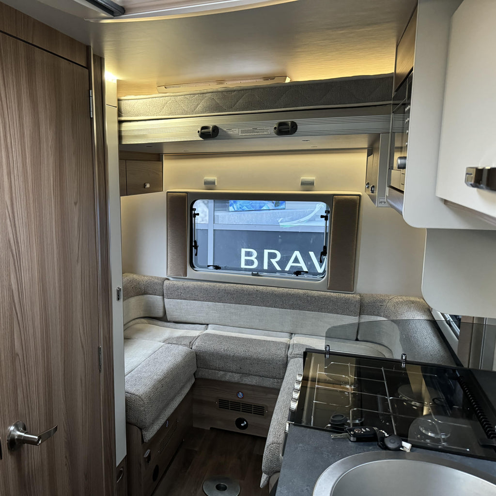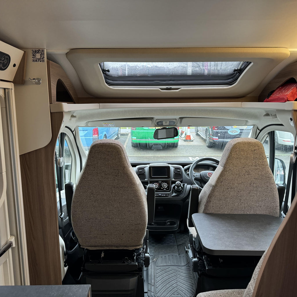 The Compact has two small double beds, one being a drop-down bed above the sitting area which is electronically controlled. The sitting area at the back of the van also pulls out to make a bed, really making the most of the space inside! Under the sitting area is where your storage is, along with some small above-head cupboards and one large one. This van has a full wet room with a toilet, basin and shower. The kitchen area has a microwave, 4-burner hob, oven, sink and large fridge with a small freezer compartment.