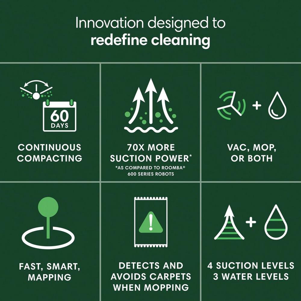 - Innovation. Only from Roomba®. - An industry first, this robot continuously crushes debris right inside using a mechanical compacting process so you don't have to empty it for up to 60 days.