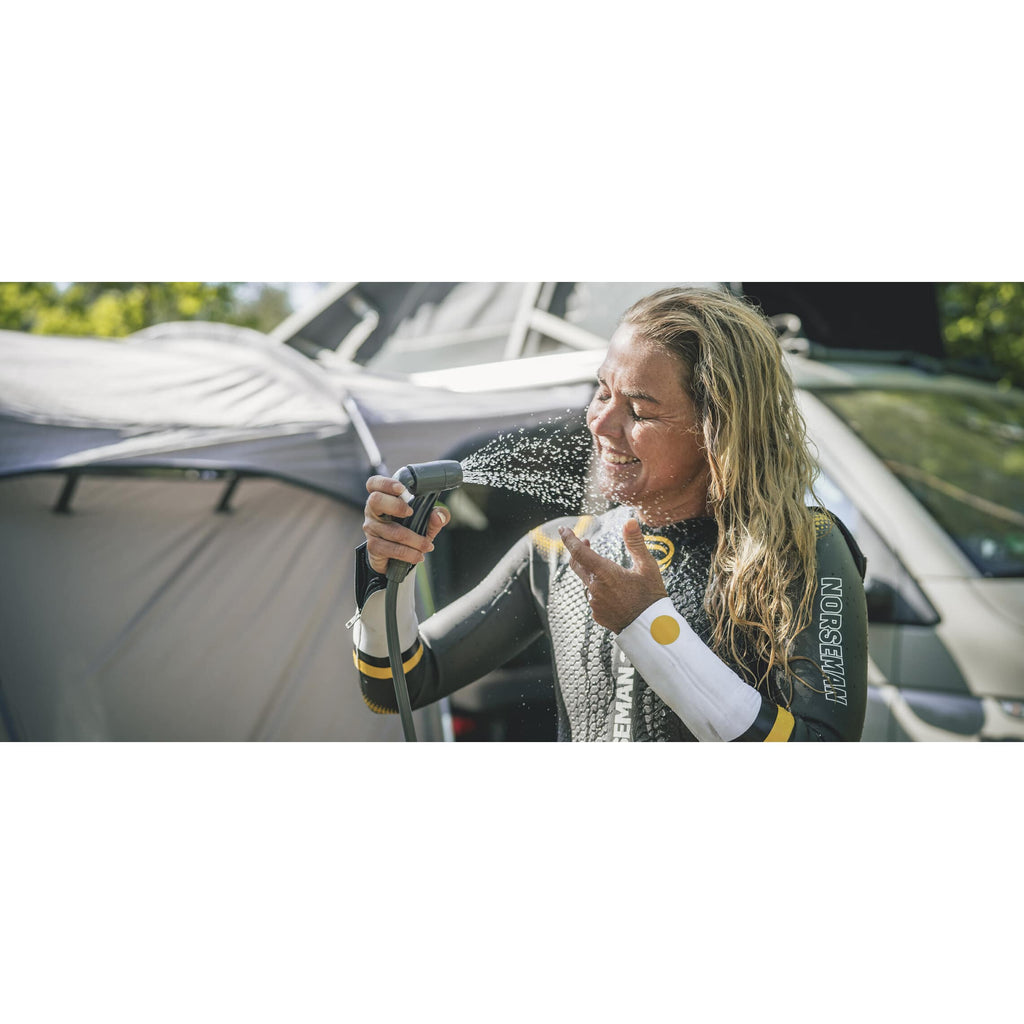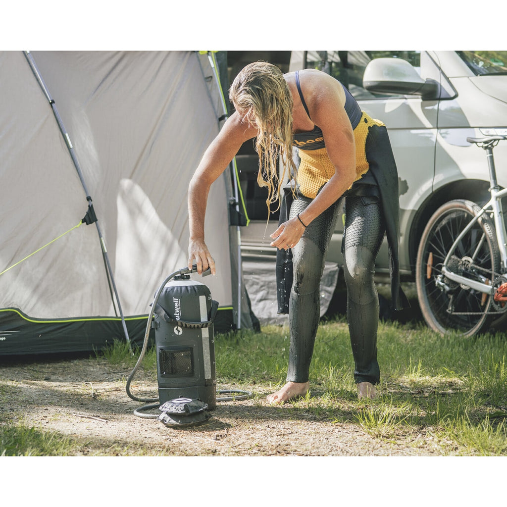 The Seabreeze Pressure Shower 12L is the epitome of outdoor bathing convenience, offering a multitude of uses beyond just campsite showering. Whether it's washing feet after a beach day, rinsing wetsuits, or cleaning your loyal canine, this shower has you covered. Its built-in PVC thermometer ensures you always have the perfect water temperature, while the freestanding design allows for hassle-free operation anywhere. With a compact pack size and a large top valve for easy filling, this pressure shower combines functionality with comfort, making it an indispensable tool for any outdoor adventure.