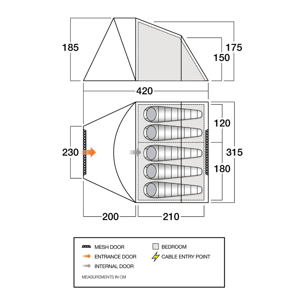 The Tiree 500 is a 5-man tunnel tent with an elevated front porch area and queen-size Midnight bedrooms. The Tiree is a versatile tent which is perfect for small families, couples, and friends going away for weekend camps or festivals. Featuring zipped mesh panels both front and rear, and a linked-in groundsheet which can be rolled away, this tent is ideal for camping in warm climates.
