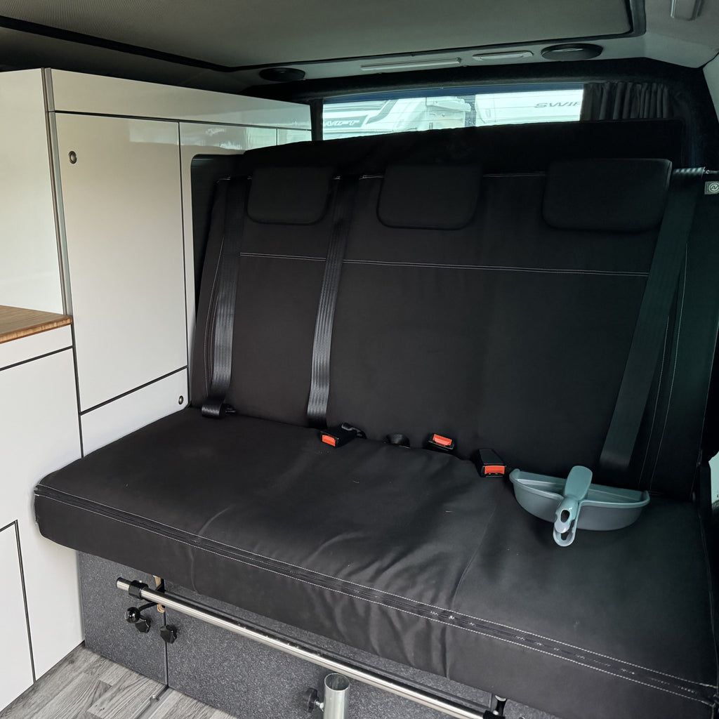 - Reimo Vairotech 3000 Rail System with sliding 3 seat with two travel positions - 3 seat rear bed seat folding bed in VW T6 Simorea upholstery. This bed is also removable when space is required in the rear of the campervan